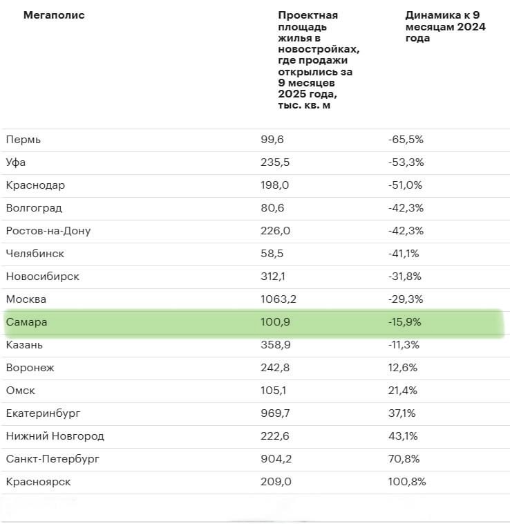 Наибольшее падение площади жилья зафиксировано в Перми (-65,5%), Уфе (-53,3%) и Краснодаре (-51,0%). В то же время, в некоторых городах наблюдается рост: в Красноярске площадь новостроек увеличилась на 100,8%, в Санкт-Петербурге — на 70,8%, а в Нижнем Новгороде — на 43,1%