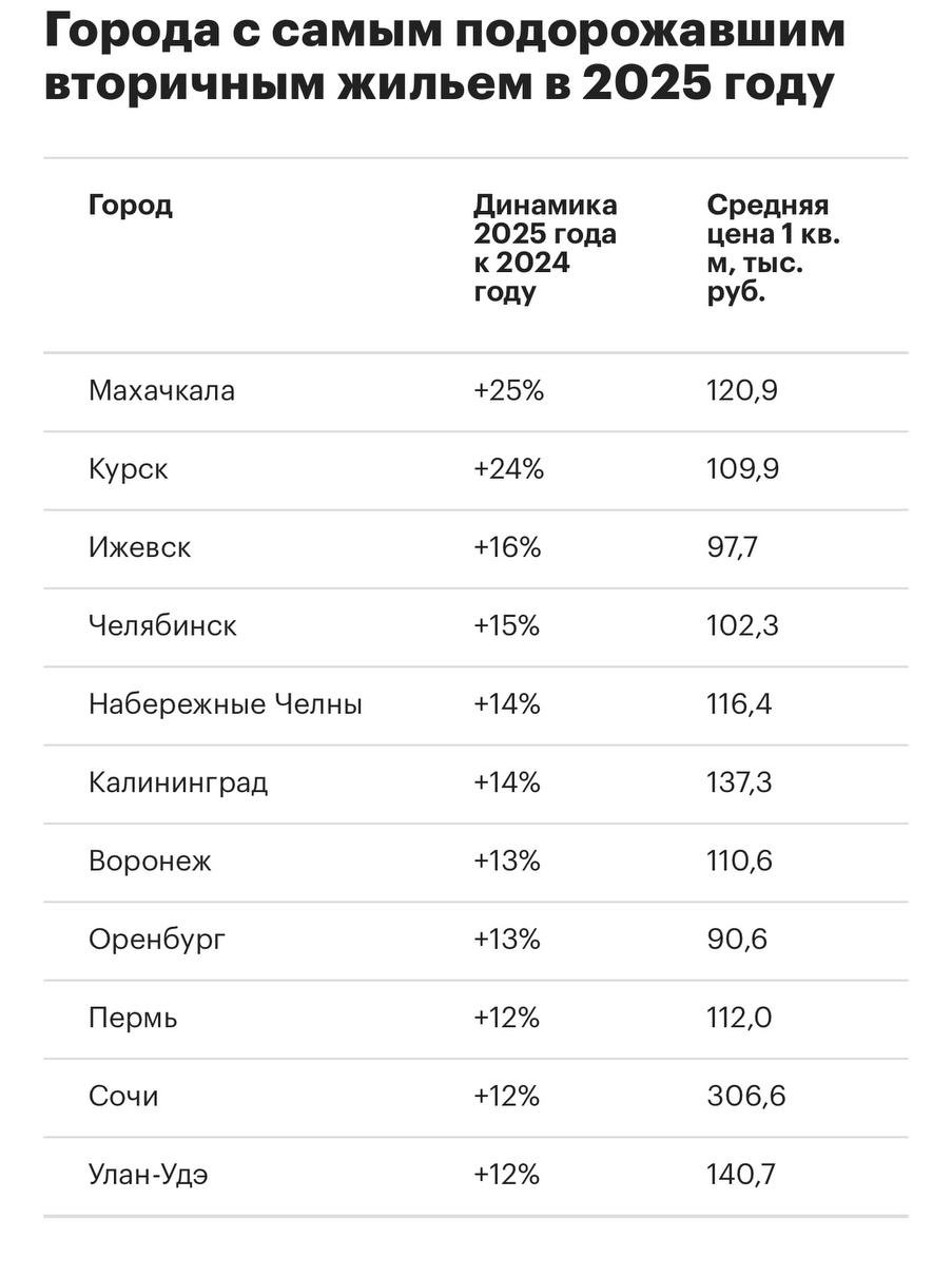 Лидером по увеличению цен на вторичное жилье стала Махачкала, где средняя цена квадратного метра в прошлом году возросла на 25%, достигнув отметки в 120,9 тыс. рублей. На втором месте с небольшим отрывом оказался Курск, где стоимость квадратного метра увеличилась на 24% и составила 109,9 тыс. рублей. Замыкает тройку лидеров Ижевск, где средняя цена 1 м² на вторичном рынке за 2025 год выросла на 16%, составив 97,7 тыс. рублей.