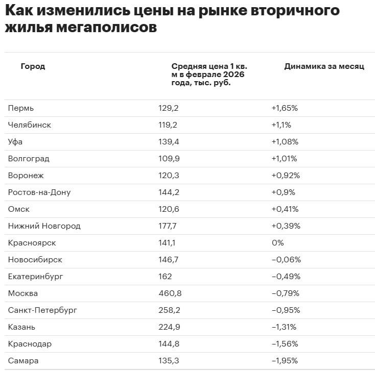 По итогам февраля самарские новостройки «подешевели» на 0,7%, а средняя стоимость вторичной недвижимости снизилась на 1,95%. Интересно, что вторичный рынок жилья в Самаре подешевел заметнее чем во всех остальных мегаполисах.